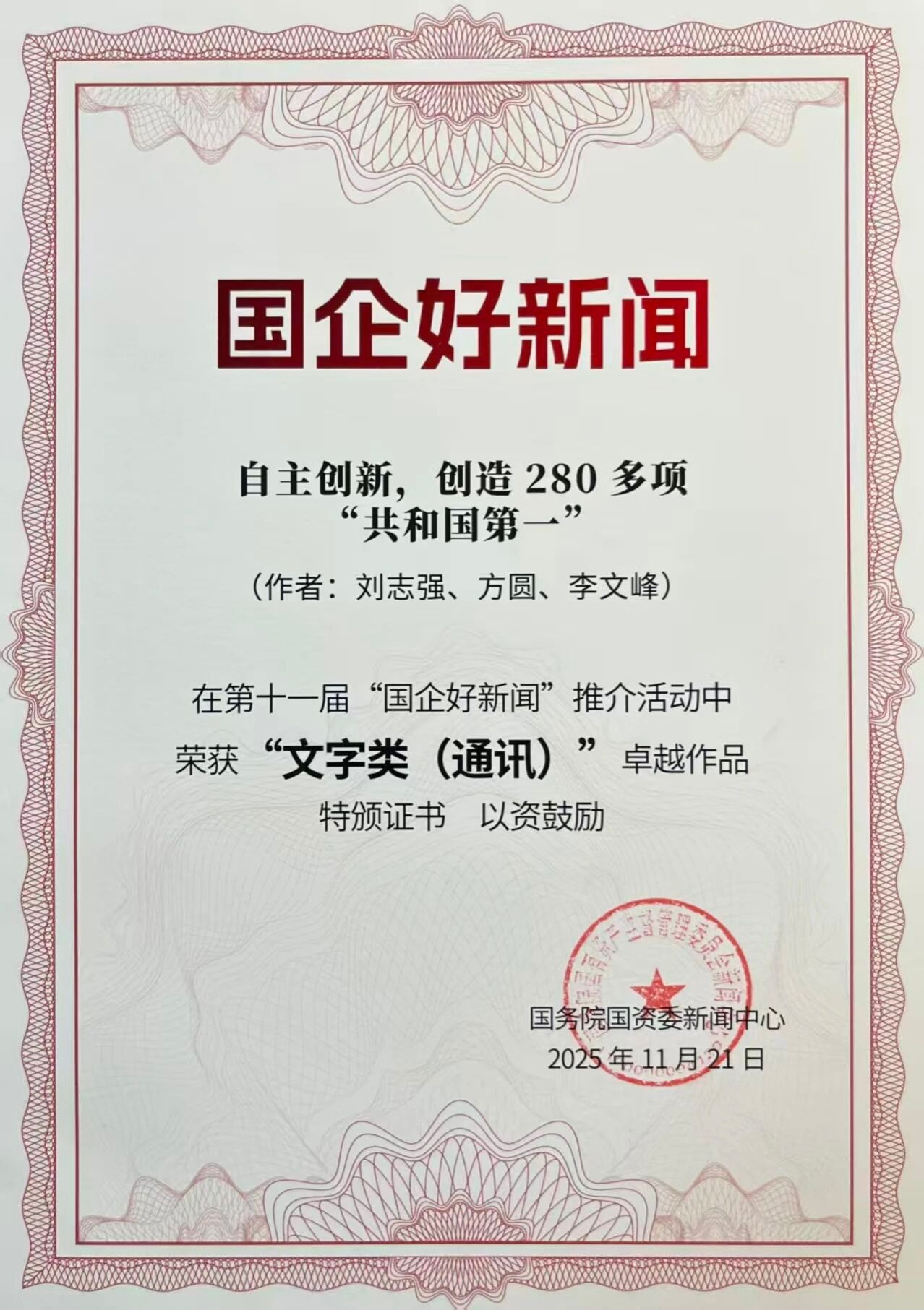 近日,第十一届“国企好新闻”推介作品正式揭晓,足球投注app 推介作品《自主创新,创造280多项“共和国第一”》,从全国央国企千余件优秀作品中脱颖而出,荣获仅5件作品获评的“文字类(通讯)”最高奖项——卓越作品。同时,足球投注app 参与的“科技创新主力军”专题宣传等5项作品荣获特别推介作品。