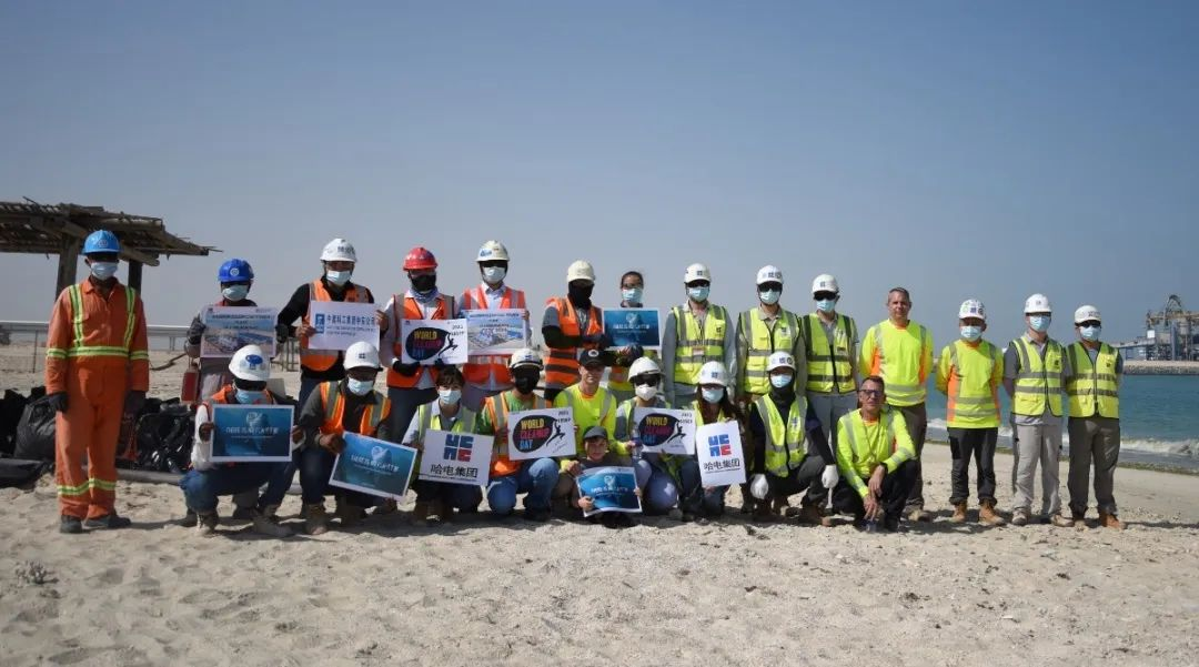 世界清洁日,迪拜哈斯彦项目部组织员工对电厂周边海岸线上的垃圾进行清理。