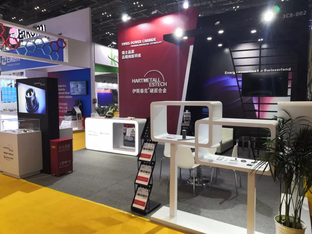 该展位分了2个展区,第一展区有两个带射灯的小柜子,柜里展出了各种牌号棒料,有带孔的和不带孔的,有介绍铭牌在边上,剩下依次有圆锯片、拉丝模、圆环、块形料等,展品丰富,整体外观很有质感,各部分压制棱角分明;