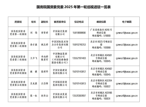 按照国务院国资委党委和巡视工作领导小组部署安排,截至2025年5月20日,国务院国资委党委2025年第一轮巡视完成进驻工作。国务院国资委党委6个巡视组将对中国国际技术智力合作集团有限公司、中国农业发展集团有限公司、中国安能建设集团有限公司、中国南光集团有限公司、中国物流集团有限公司、中国绿发投资集团有限公司等6家企业党委开展常规巡视,对中国物流集团有限公司所属中国铁路物资股份有限公司党委开展提级巡视。