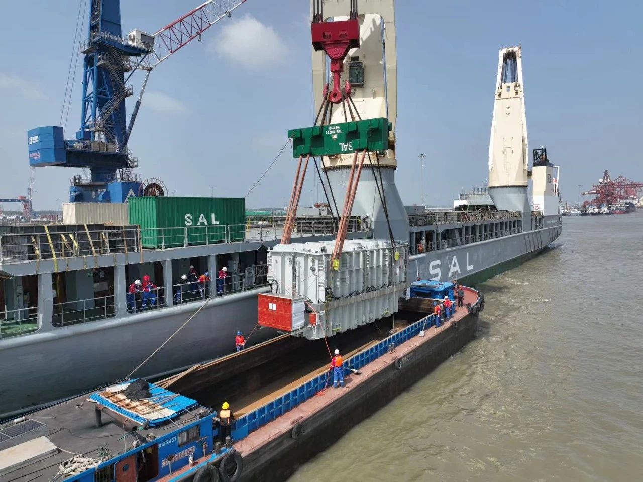 本次发运的主变压器本体运输重量为286吨,采用德国SAL公司旗下起吊能力达2000吨的重吊船进行装运。设备发运过程中,哈电国际物流管理团队根据设备出厂时间灵活选择装运船舶、高效制作运输方案、精准把控受载船期,高质量完成了本次装船作业,成功迈出了主变压器本体多式联运工作的第一步,为即将到来的总行驶里程近28000公里的洲际远洋运输、内河内海运输、跨国内陆运输夯实了基础。