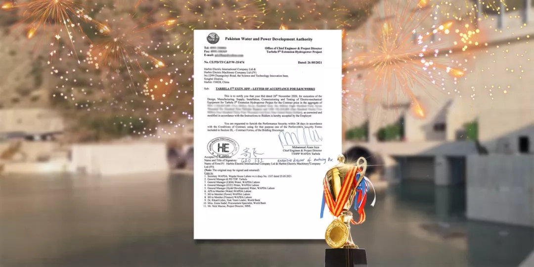 电机公司收到巴基斯坦水力开发署发来的中标通知书,Tarbela(塔贝拉)5期水电扩建3台单机容量470兆瓦混流式水电机组均被哈电电机囊括。该项目是哈电电机继巴基斯坦NJ项目后在海外水电市场的又一重大突破,也是哈电电机直接对外参与并中标的单机容量最大的国际水电项目。