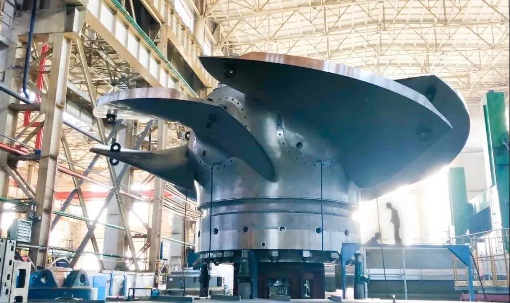 水口电站是华东地区最大的水电站,被誉为“五朵金花”之首。水口转轮单机额定出力235兆瓦,总重超290吨,总高约6.4米,最大外圆直径8米。转轮装配采用接力器缸传动形式,整体结构复杂、装配难度极大,需要双吊车同步吊运完成总装任务。