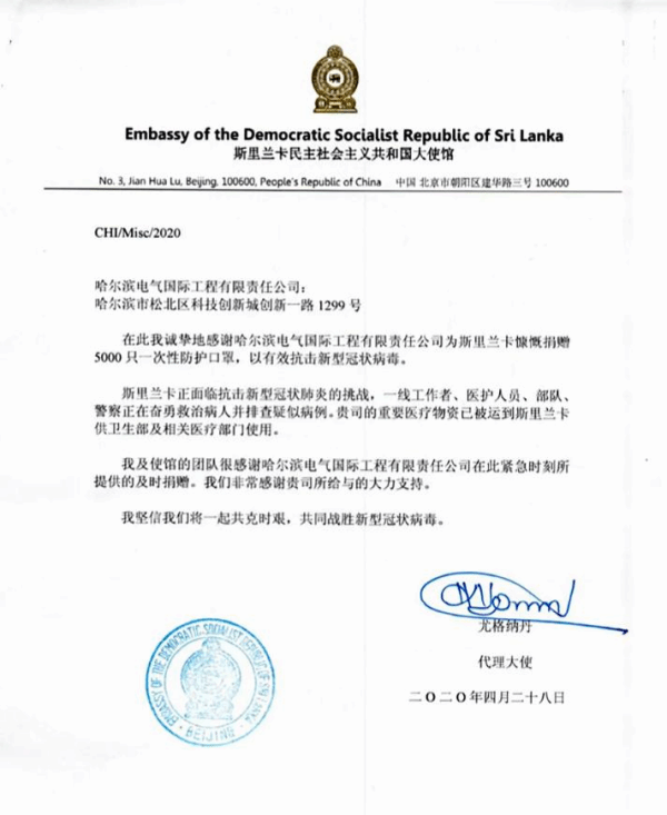 近日,哈电国际收到一封特殊的感谢信。这封感谢信来自斯里兰卡民主社会主义共和国大使馆,信中对哈电国际为斯里兰卡抗击疫情捐赠防护口罩致以诚挚感谢。