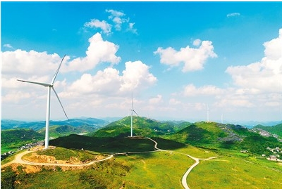 贵州省铜仁市凭借区位优势和丰富的风能资源,加速风电产业布局与发展。南方电网贵州铜仁供电局全力服务绿色清洁能源的高效并网和充分消纳,助推地方实现低碳转型目标。图为该市松桃苗族自治县盘石镇芭茅村山脊上,风力发电设备随风转动发电。向世杰摄(人民视觉)