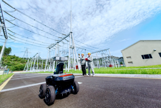 国网湖北电力员工运用智能巡检机器人在十堰市茅箭区220千伏龙虎沟变电站进行设备巡视。