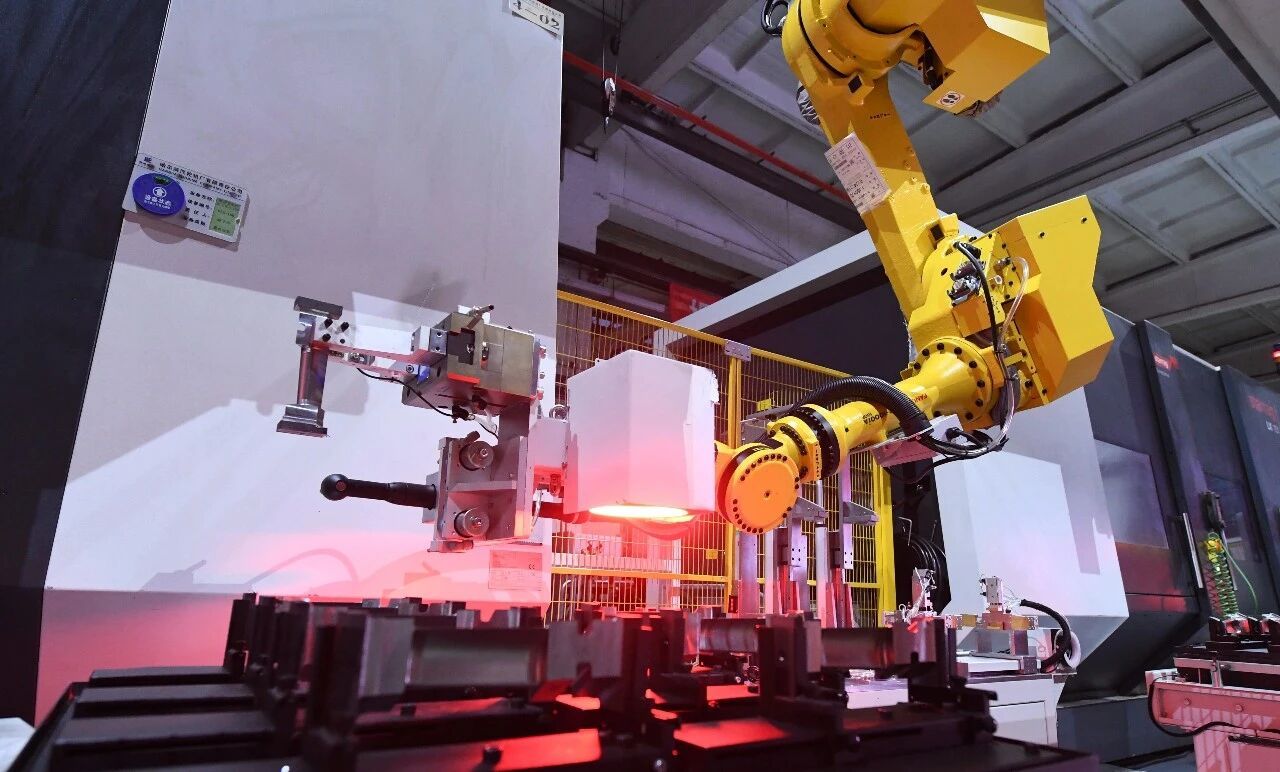 汽轮机公司中小叶片自动加工产线机械手臂正在装卡叶片。