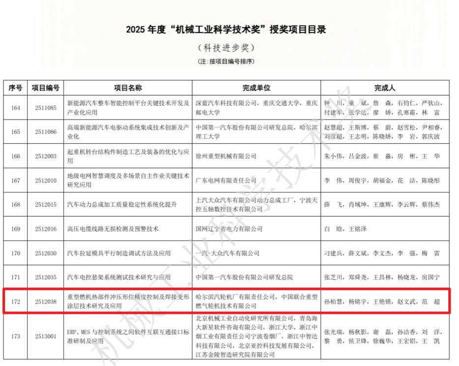 近日,中国机械工业联合会与中国机械工程学会联合发布《关于表彰2025年度“机械工业科学技术奖”奖励项目的通报》,哈电汽轮机主导的“重型燃机热部件冲压形位精度控制及焊接变形涂层技术研究及应用”工人创新项目,荣获2025年度机械工业科学技术奖二等奖。