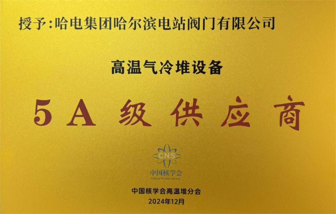 近日,哈电阀门喜获中国核学会高温堆分会颁发的“高温气冷堆设备5A级供应商供”荣誉称号,标志着客户对哈电阀门的高度认可,也标志哈电阀门在该领域取得了跨越式成绩。