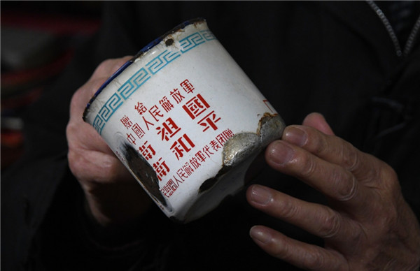 多年来,他只是小心翼翼地,把1954年“全国人民慰问人民解放军代表团”颁发的一个搪瓷缸,摆在触手可及的地方。这只补了又补、不能再用的缸子上,一面是天安门、和平鸽,一面写着:赠给英勇的中国人民解放军——保卫祖国、保卫和平。