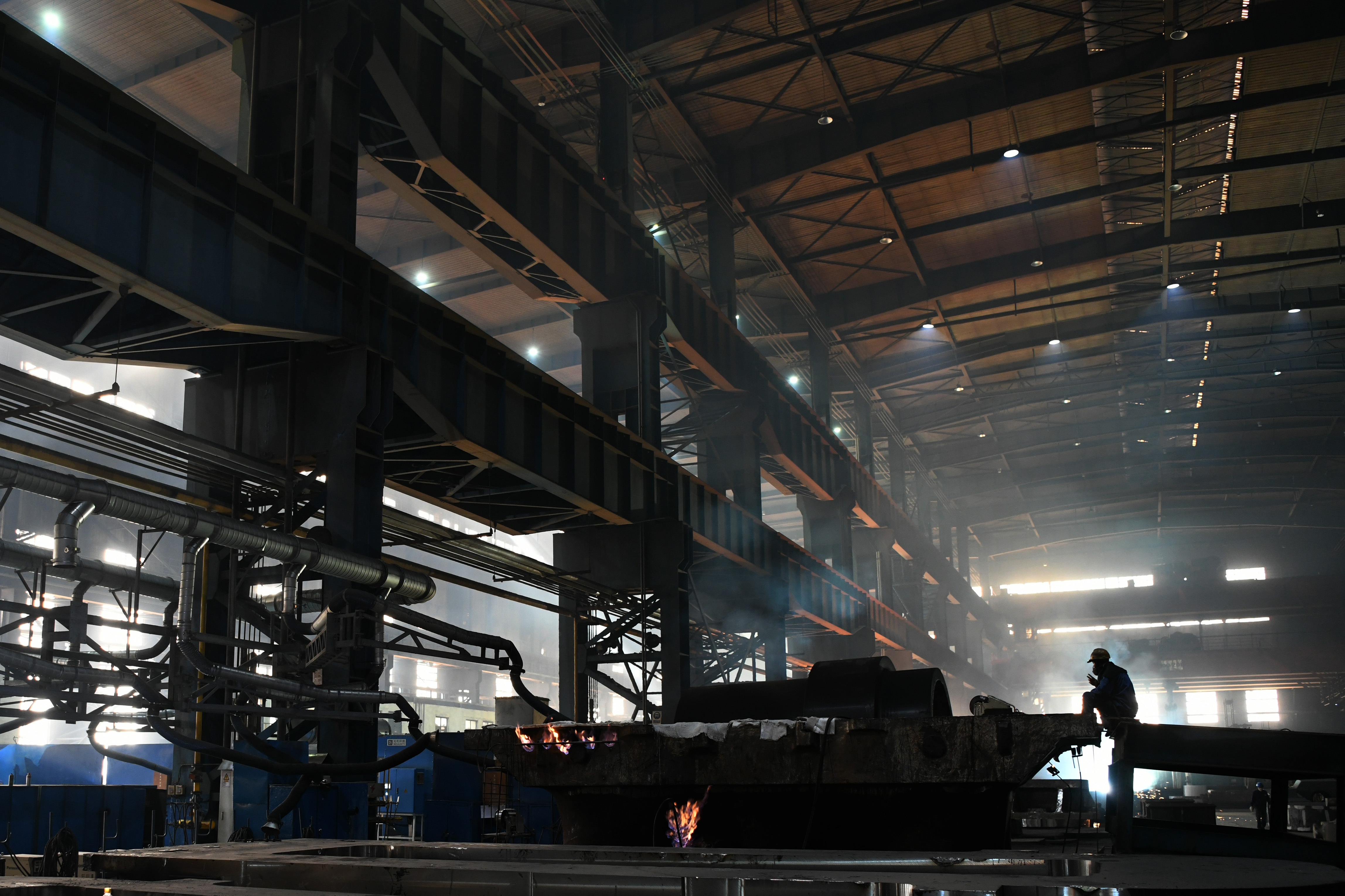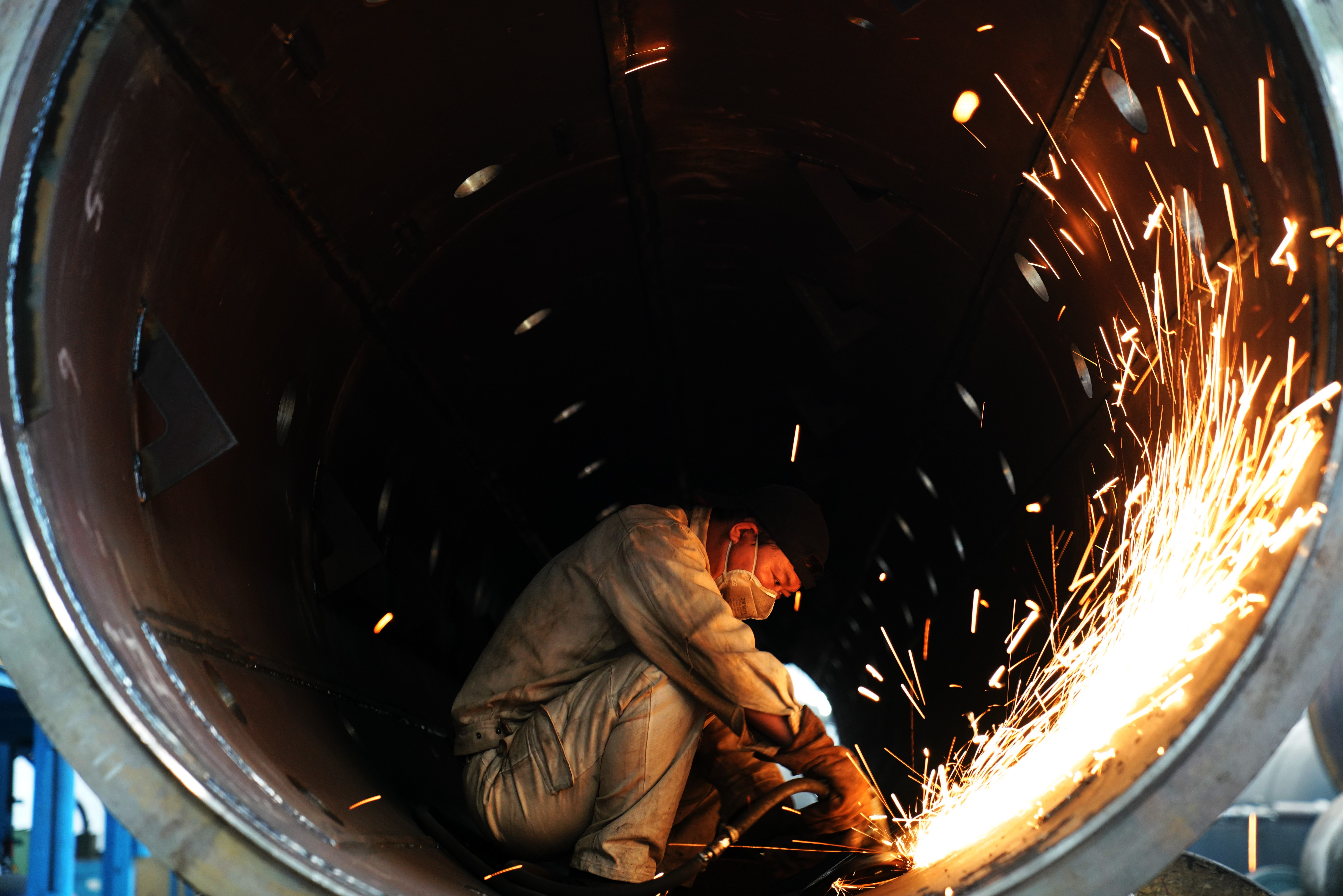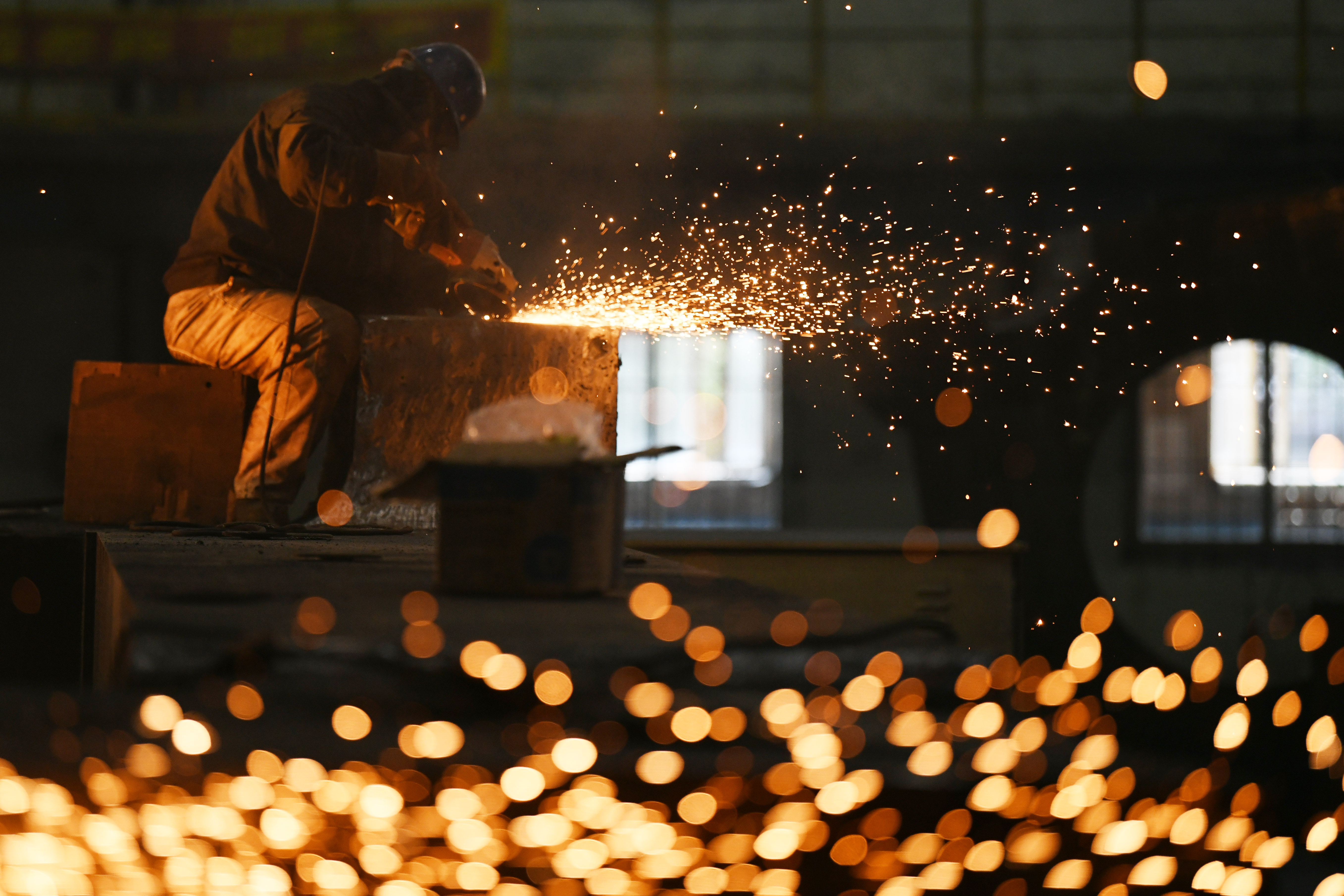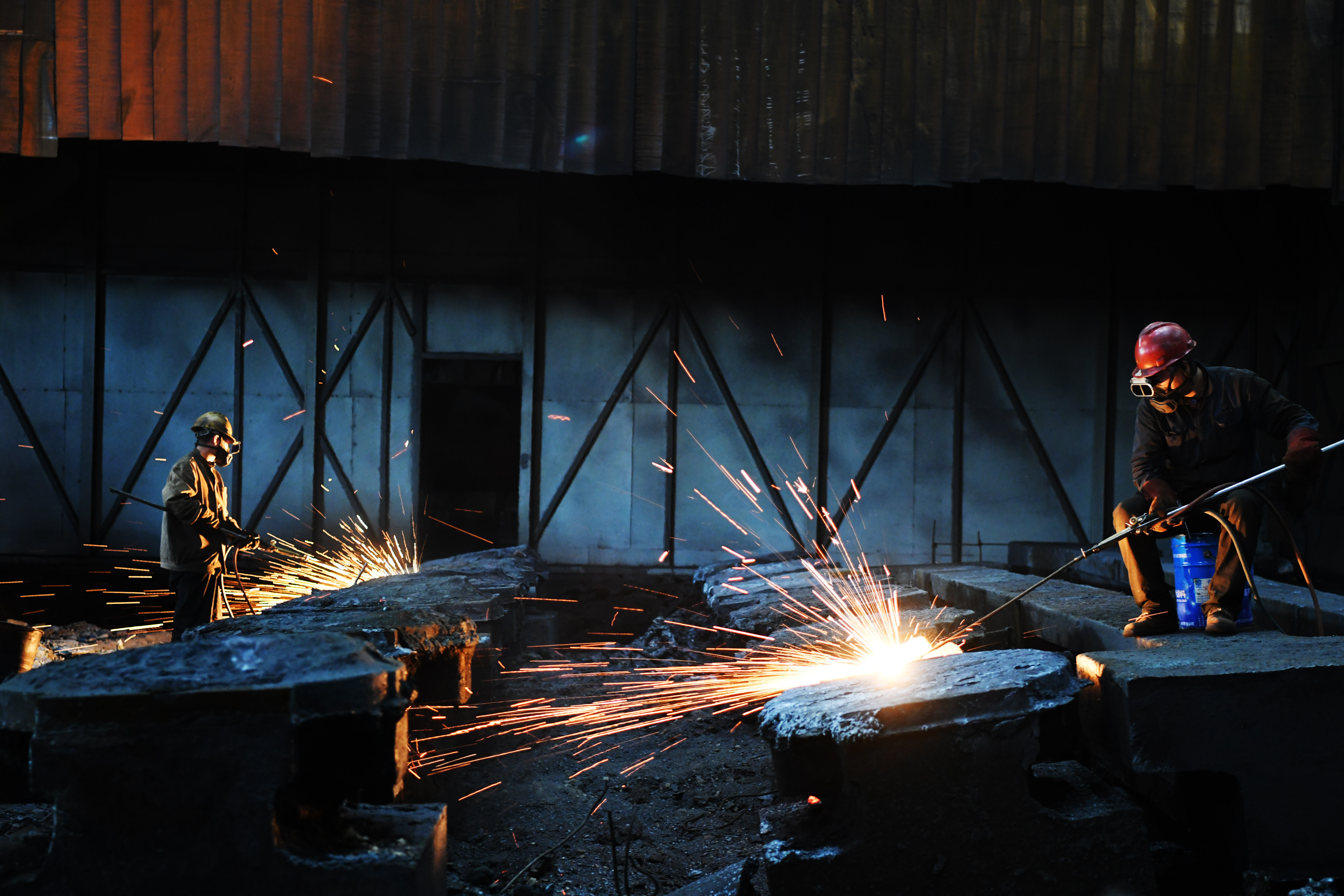 ↑在中国一重集团有限公司的厂房内,工人在进行生产作业(8月29日摄)。