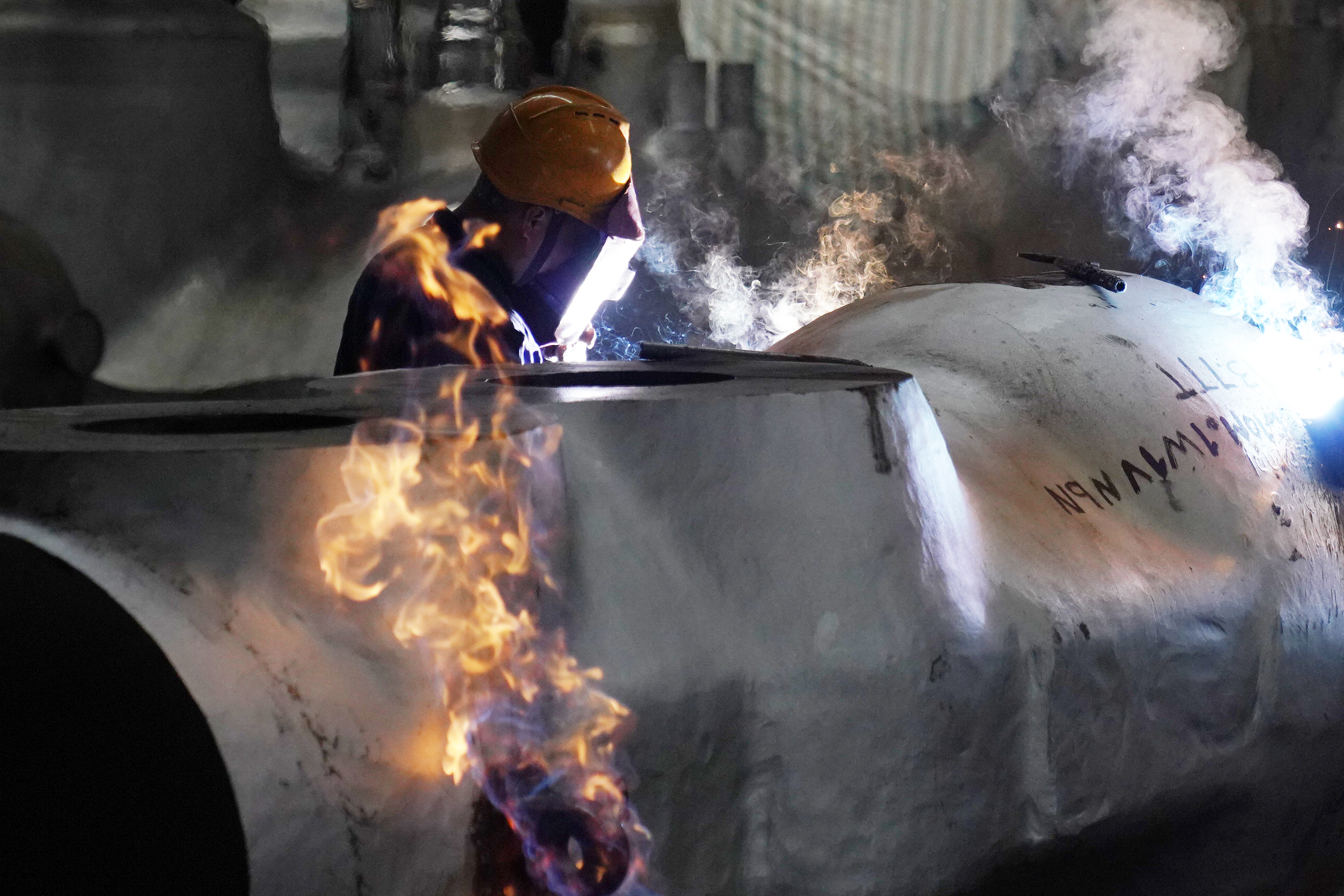 哈尔滨锅炉厂有限责任公司厂房内,工人在进行生产作业(9月4日摄)。