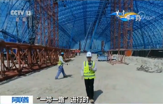 央视记者 李大杰:我身后在建的就是哈斯彦清洁燃煤电站项目一号储煤场,大家千万不要小看这座储煤场,因为它正在创造一项不大不小的世界纪录。在它建成之后,它将成为世界上同类电站当中,单体面积最大的储煤场。面积有多大呢?给大家两组数据:第一就是它的面积是在83000平方米左右,这个面积相当于12座标准足球场的面积;第二它整个的用钢量是在8100吨左右,这相当于一座巴黎的埃菲尔铁塔。
